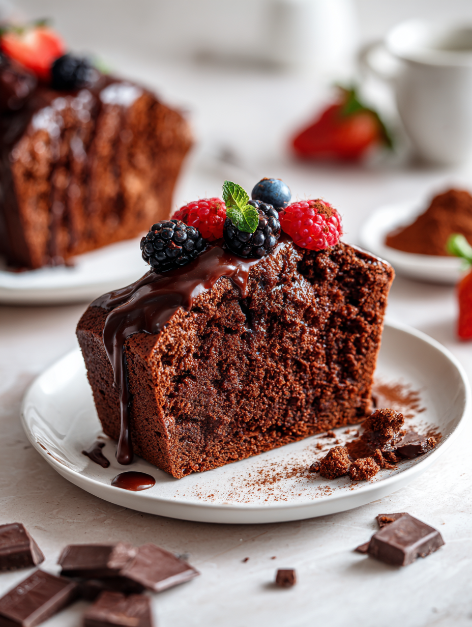 Focusing on the nostalgic comfort of a homemade chocolate pound cake that feels like a warm hug on a chilly day, emphasizing the sensory joy of rich cocoa aroma and dense, melt-in-your-mouth texture.